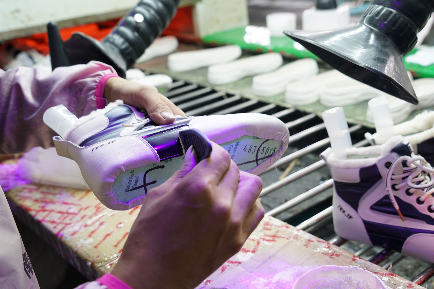 記者來到制鞋車間內,工人們正熱火朝天地忙碌著。記者在現場看到,在刷膠這道工序中,工人們都在一個集氣罩下進行操作。